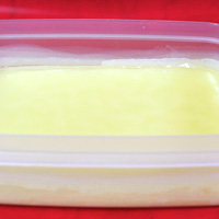 タッパーに液体を移し冷やして固めます。これでミツロウ・ワックスの出来上がりです。(左の写真が固まったものです)